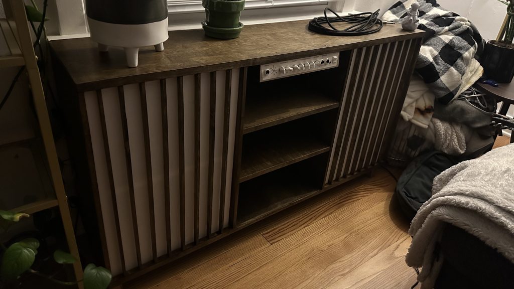 In early 2023 I was challenged with building a piece of furniture that captured the style of an established space, while also adding a guitar amp to the room. This was a unique opportunity to use a combination of my skills in one project. I took an existing guitar amp, designed a new housing for all the circuitry, bent sheet metal to enclose everything and mounted it to a small credenza I built. The final product is the culmination of so many years of learning, from the outer hardwood box down to the tiny resin printed knobs. To this day its one of my proudest creations. The finished credenza can be seen in the gallery below or the on the Woodworking page.